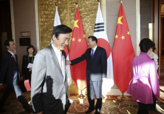 李克強總理會見韓國總統樸槿惠時對方提出,韓方愿同中方等各方加強溝通協調,爭取新一輪韓中日領導人會議早日舉行。李克強說:"希望在重大問題上,日方能與中方、韓方相向而行。"