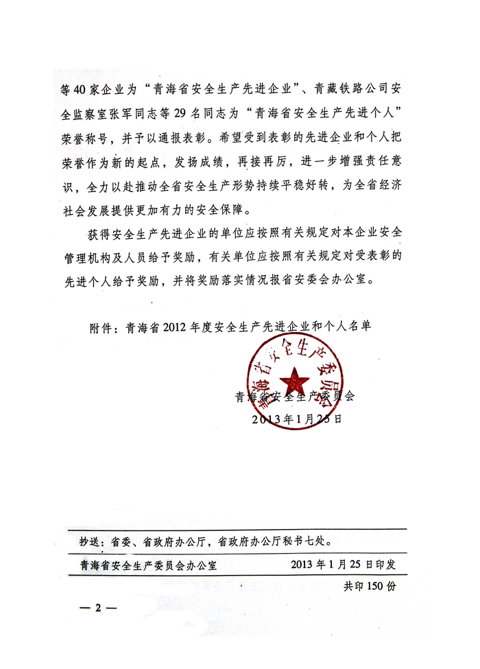 2012年,在省委、省政府的正確領導下,青海省物產集團總公司認真學習貫徹黨的十八大精神,全面貫徹落實科學發展觀,牢固樹立以人為本、安全發展的理念,深入開展"安全生產年"、"隱患排查治理"、"打非治違"等活動,為促進全省安全生產形勢持續穩定好轉做出了積極貢獻。為此,經省政府同意,省安全生產委員會決定授予青海省物產集團總公司"2012年度安全生產先進企業"榮譽稱號。